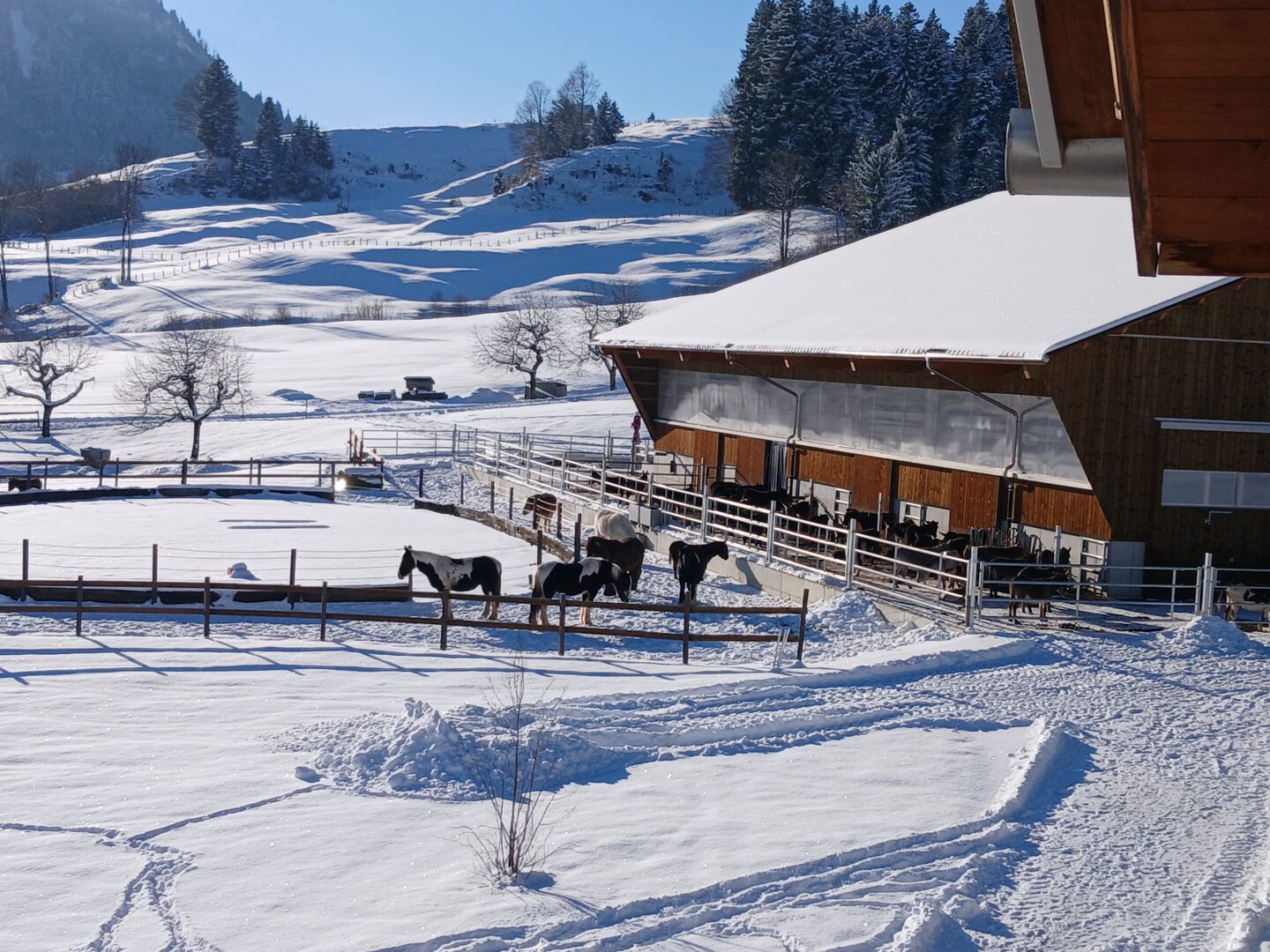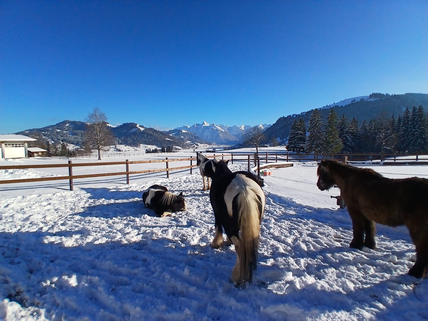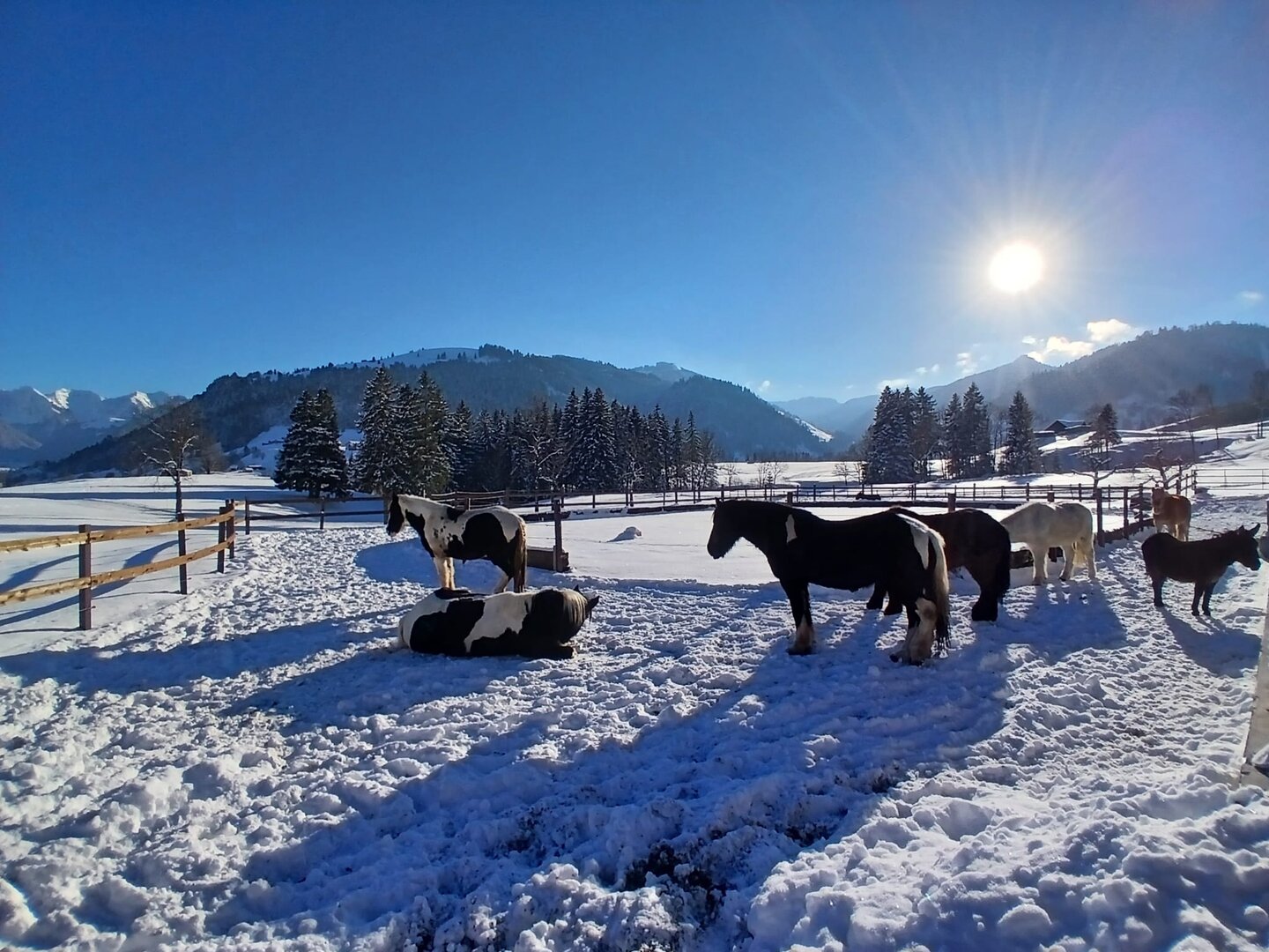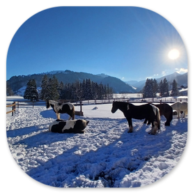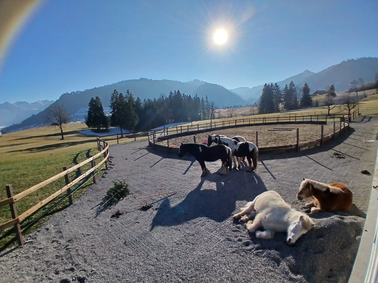 Auf unserer Sihlsee Ranch dürfen Pferde und Esel in Gruppenhaltung mit viel Auslauf leben. Im Winter können sich die Tiere neben dem Gruppenoffenstall auch noch auf dem Rundtrail bewegen und im Sommer erhalten sie viel Weidegang. Das Wohl der Tiere liegt uns am Herzen und so ist auch eine langsame Integration von neuen Tieren in die Herde für uns selbstverständlich. Am Anfang dürfen die neuen Pferde als Nachbarn zur Gruppe leben und sich langsam aneinander gewöhnen.