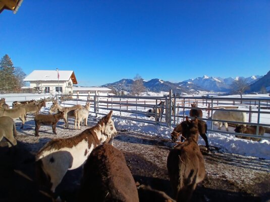Unser Esel geniessen die Sonne an diesem kalten Wintertag auf der Sihlsee Ranch!